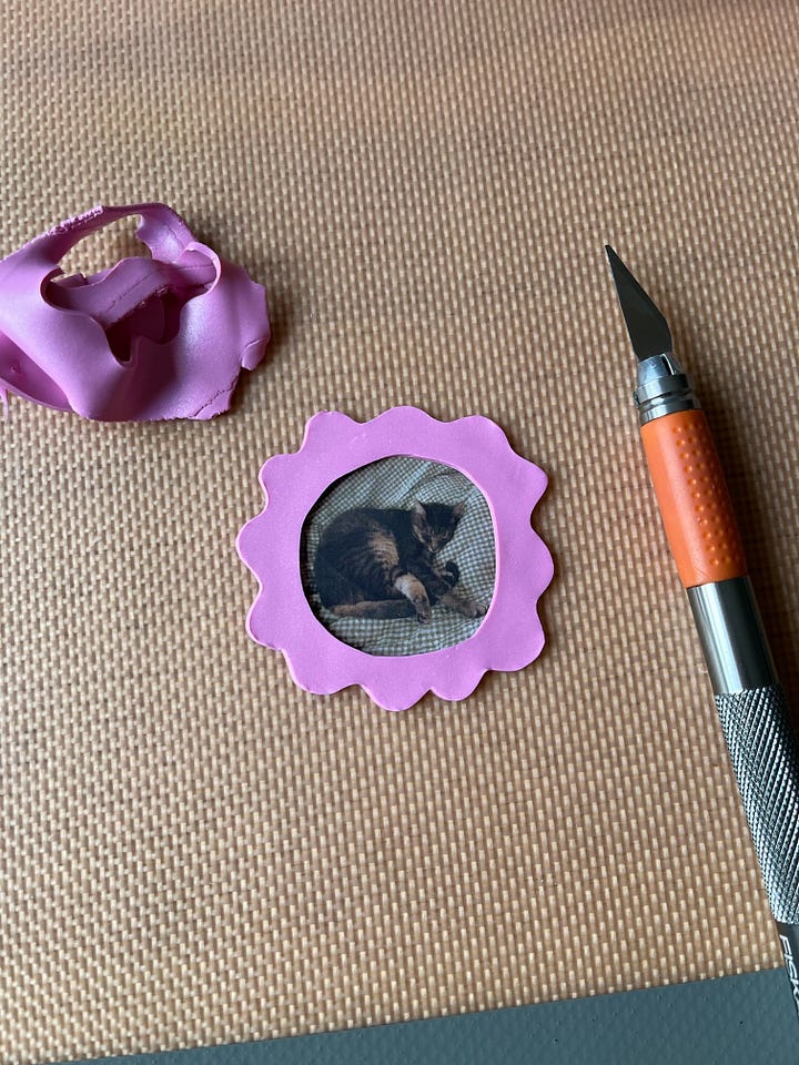 Take a sheet of clay that’s a bit bigger than your photo and lightly mark the corners of the photo with a pointy tool so you know the size.